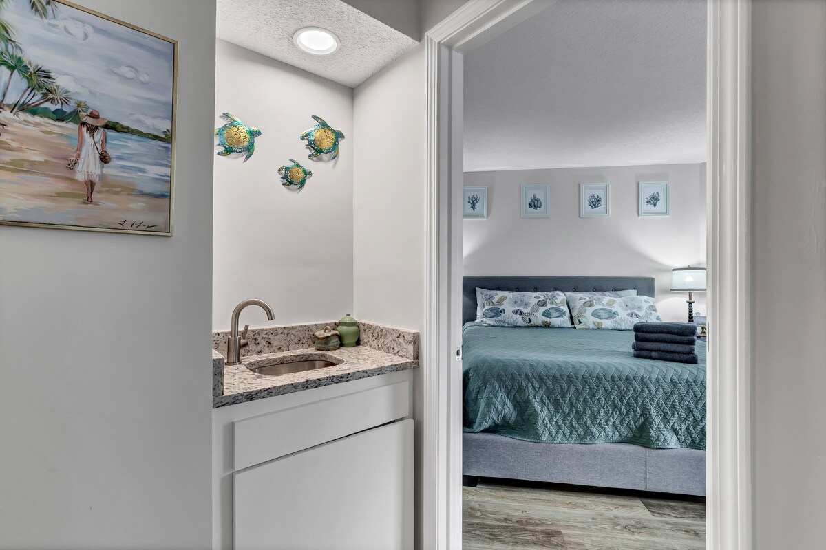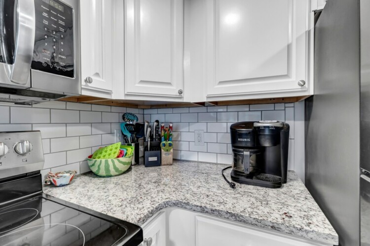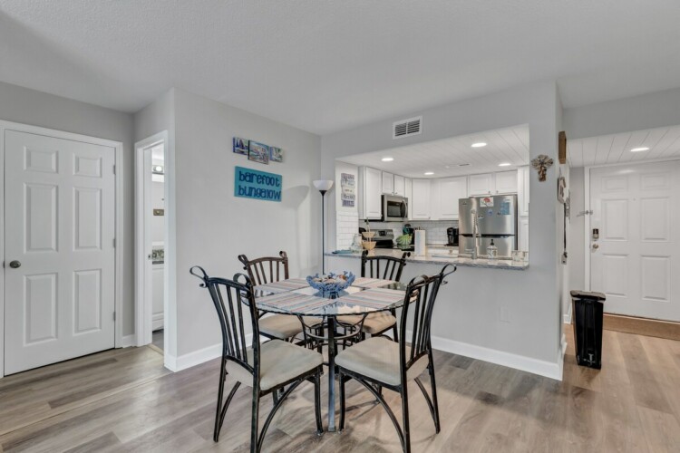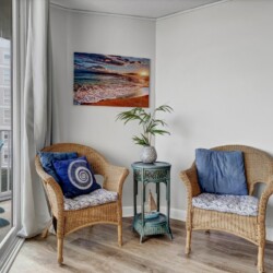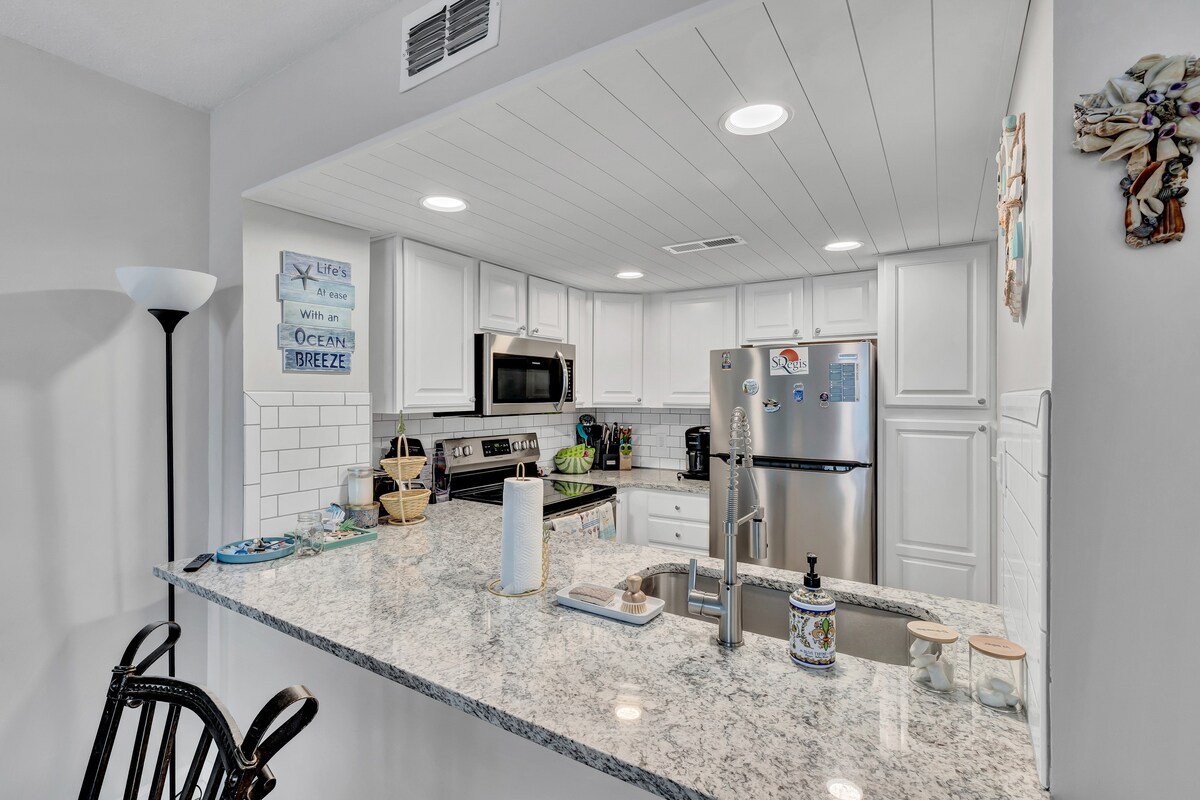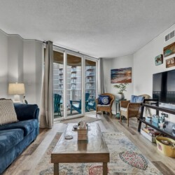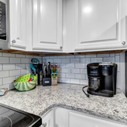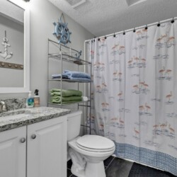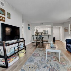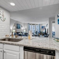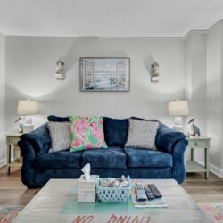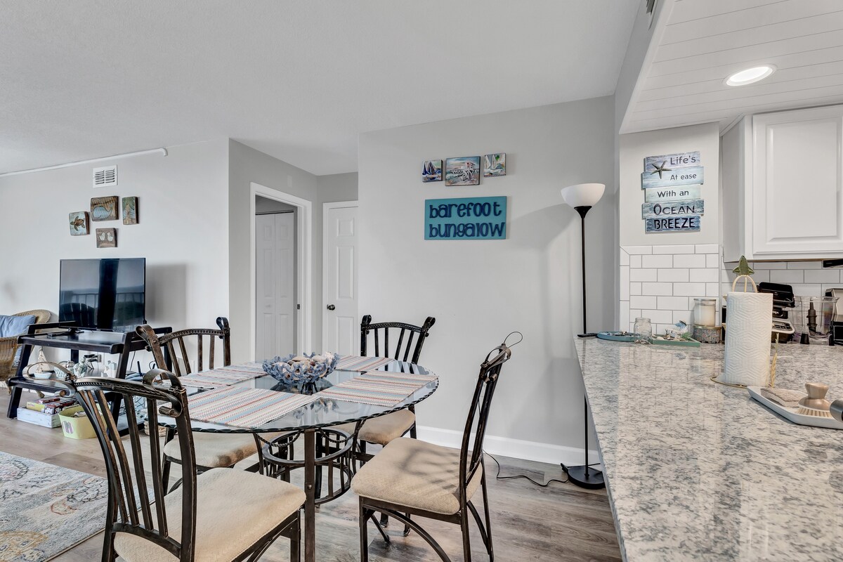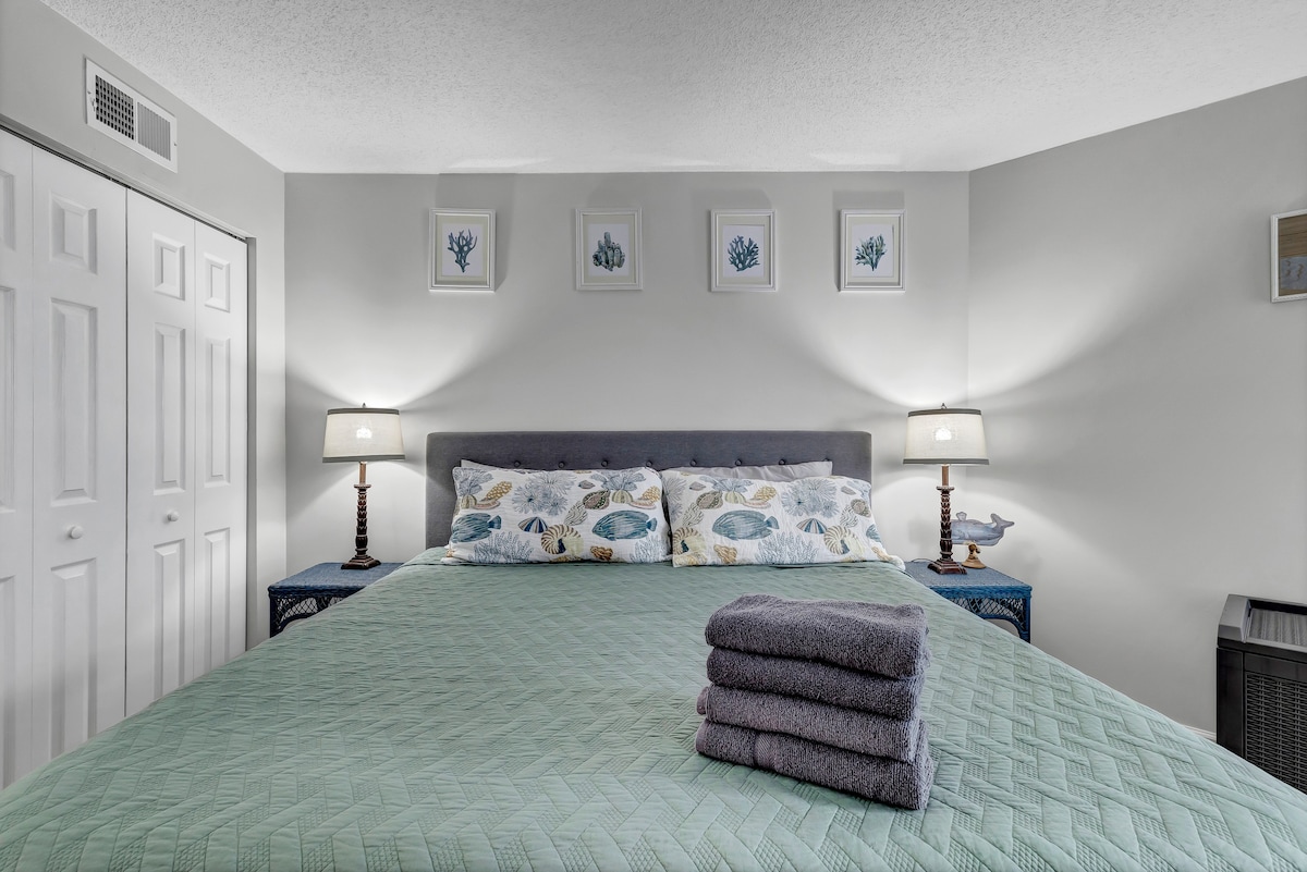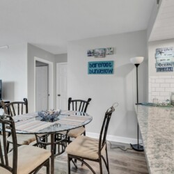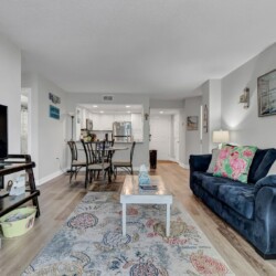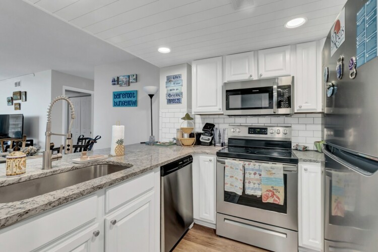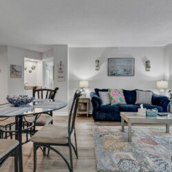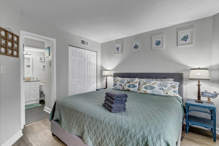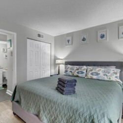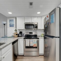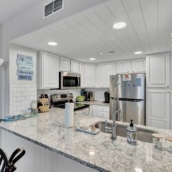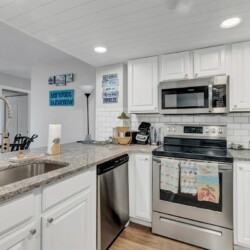 This updated condo is the perfect place to call home during your beach vacation! The main living areas feature an open concept layout. There’s plenty of seating for your group between the living room and dining area. The kitchen has been renovated with granite countertops, subway tile back splash, and stainless steel appliances. It is stocked with the essentials that you’d need to enjoy a meal in during your stay, and is open to the living areas so you don’t have to feel closed off from everyone else. The primary suite has a comfortable king size bed with it’s own bathroom. The second bedroom includes a queen and twin bed.