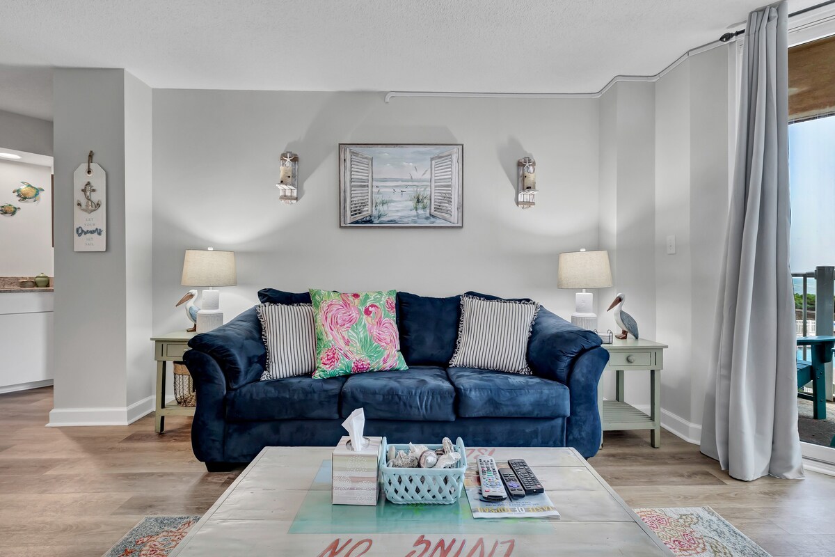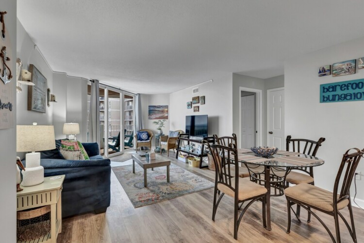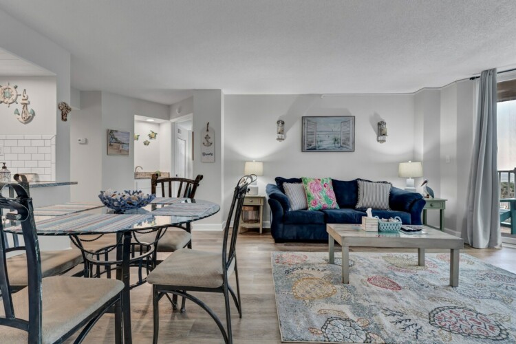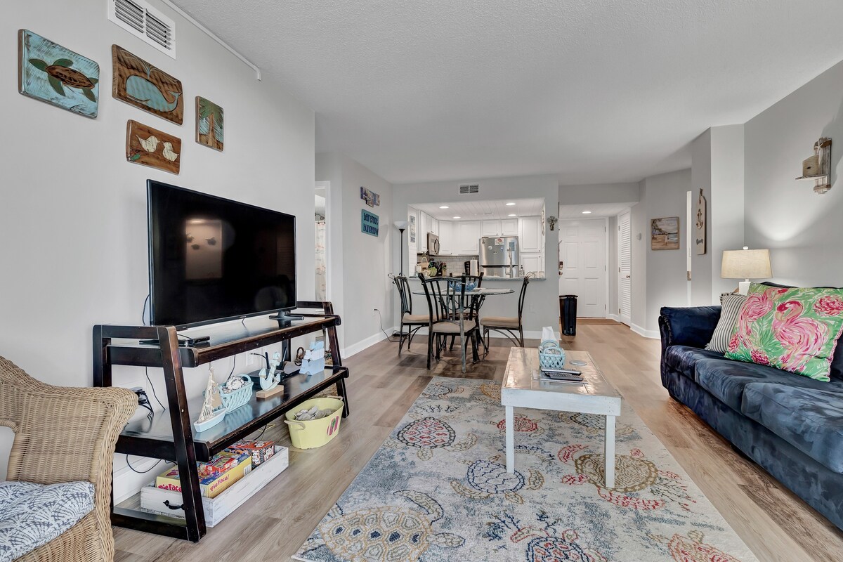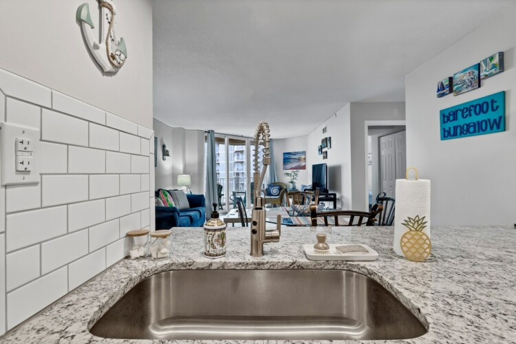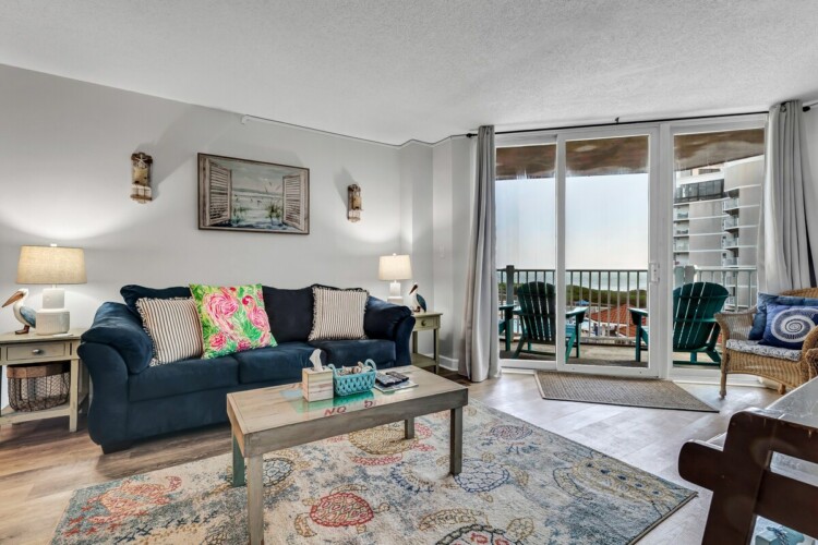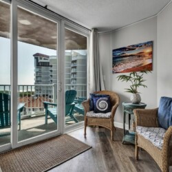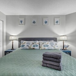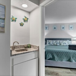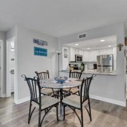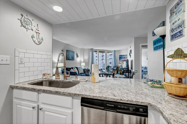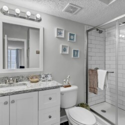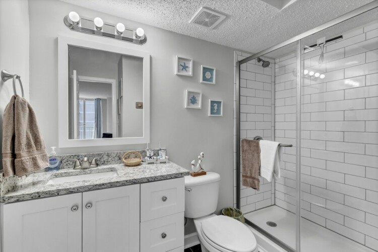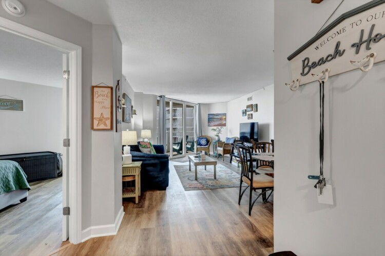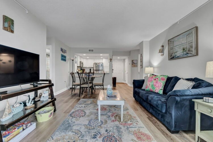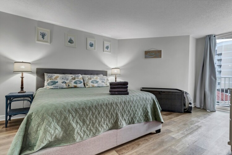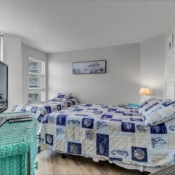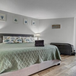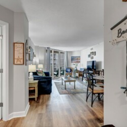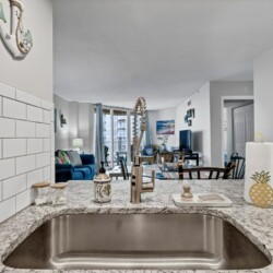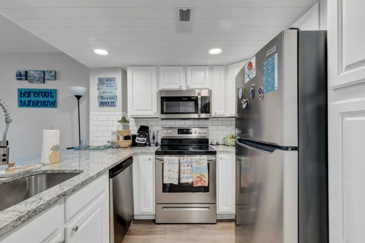 This updated condo is the perfect place to call home during your beach vacation! The main living areas feature an open concept layout. There’s plenty of seating for your group between the living room and dining area. The kitchen has been renovated with granite countertops, subway tile back splash, and stainless steel appliances. It is stocked with the essentials that you’d need to enjoy a meal in during your stay, and is open to the living areas so you don’t have to feel closed off from everyone else. The primary suite has a comfortable king size bed with it’s own bathroom. The second bedroom includes a queen and twin bed.