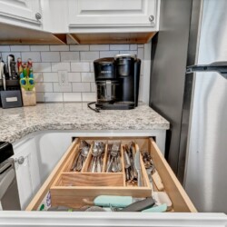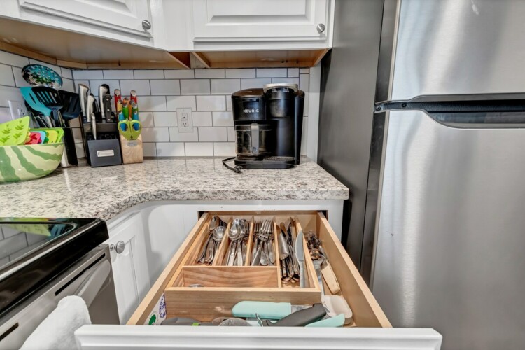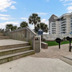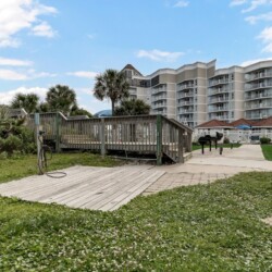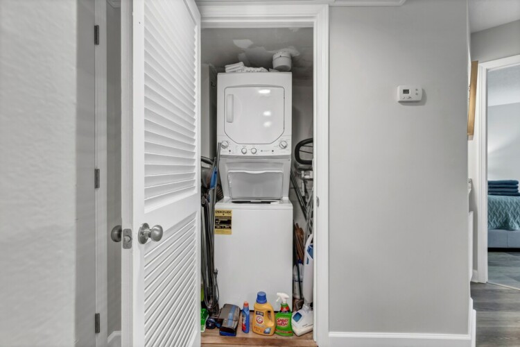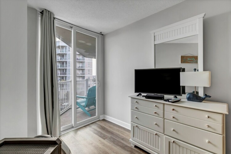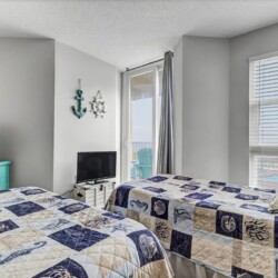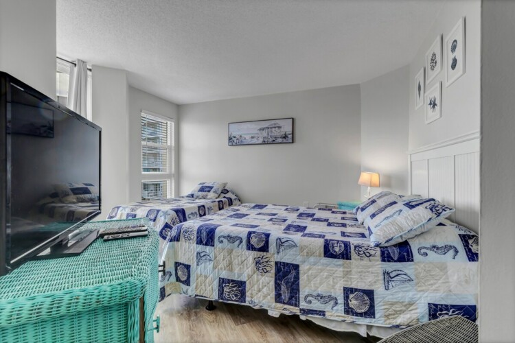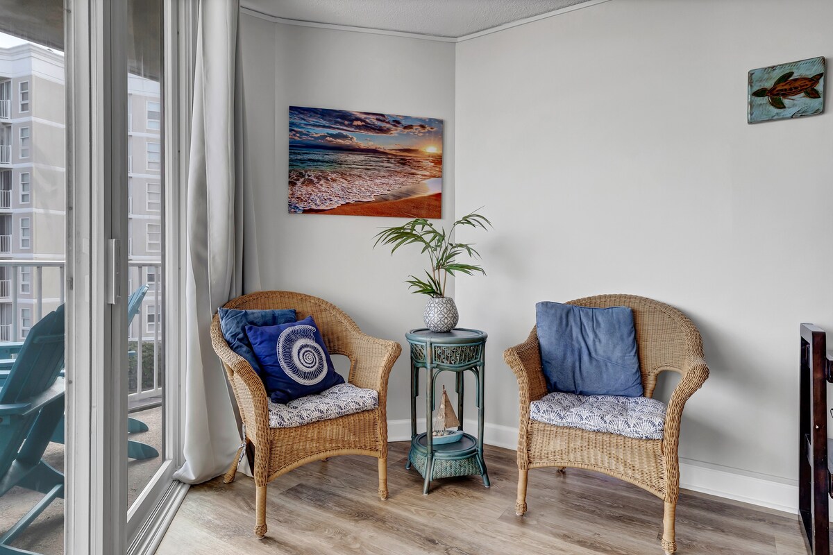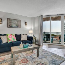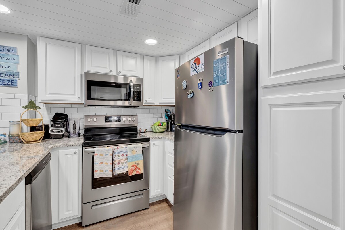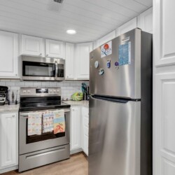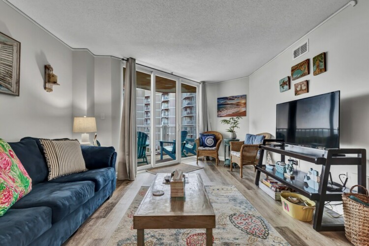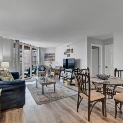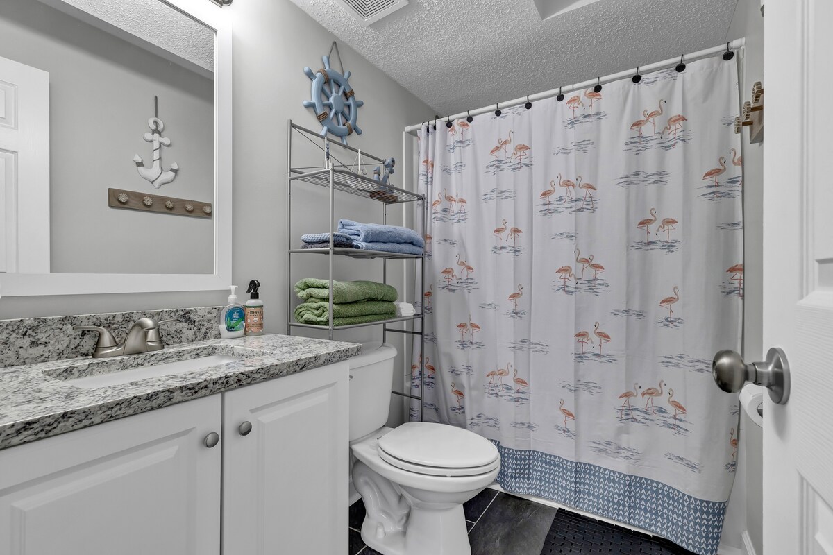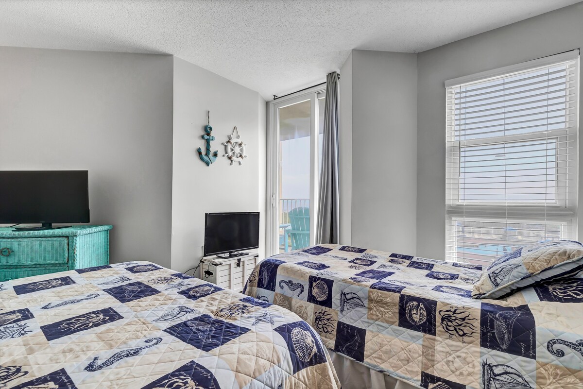 This updated condo is the perfect place to call home during your beach vacation! The main living areas feature an open concept layout. There’s plenty of seating for your group between the living room and dining area. The kitchen has been renovated with granite countertops, subway tile back splash, and stainless steel appliances. It is stocked with the essentials that you’d need to enjoy a meal in during your stay, and is open to the living areas so you don’t have to feel closed off from everyone else. The primary suite has a comfortable king size bed with it’s own bathroom. The second bedroom includes a queen and twin bed.