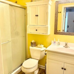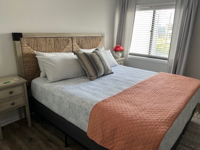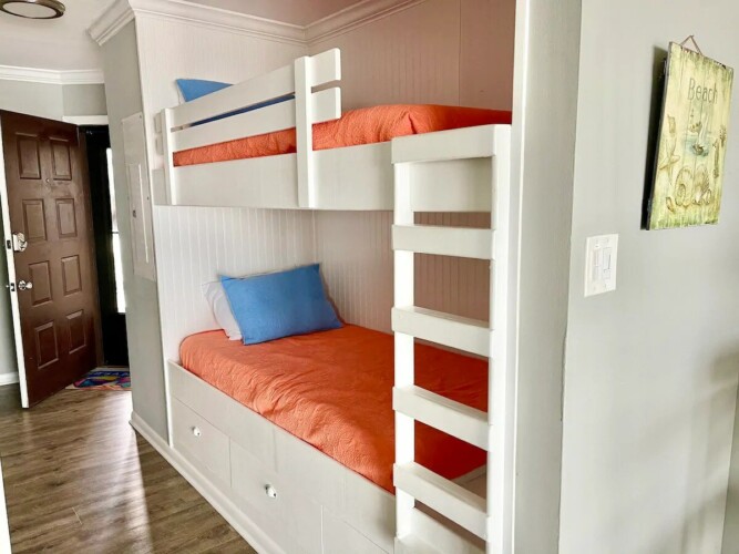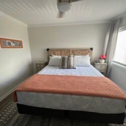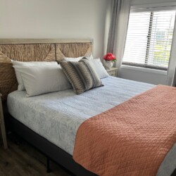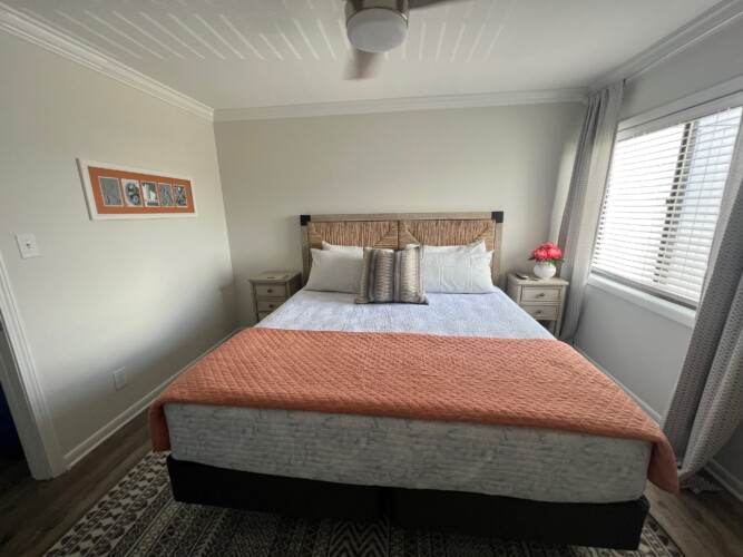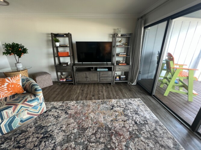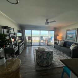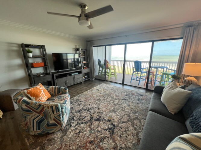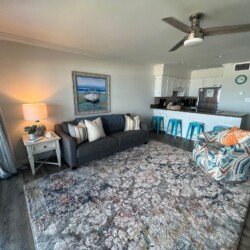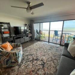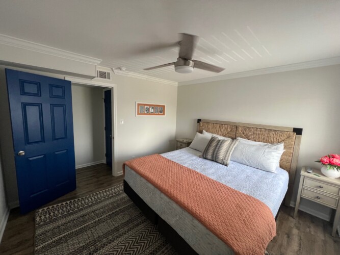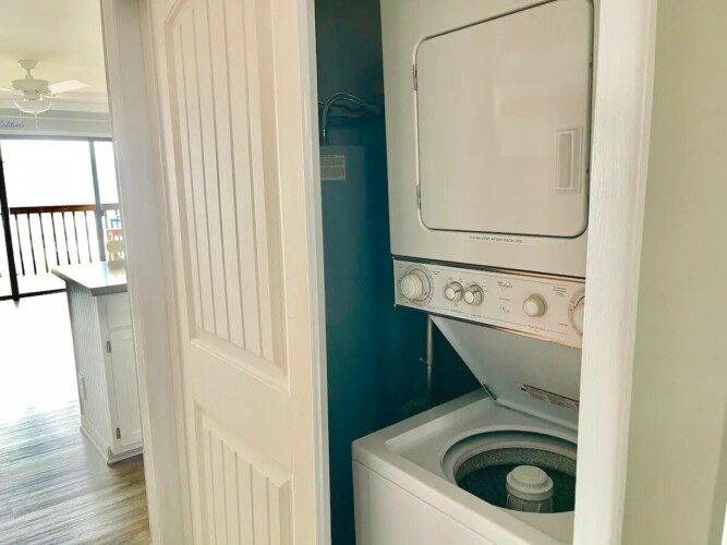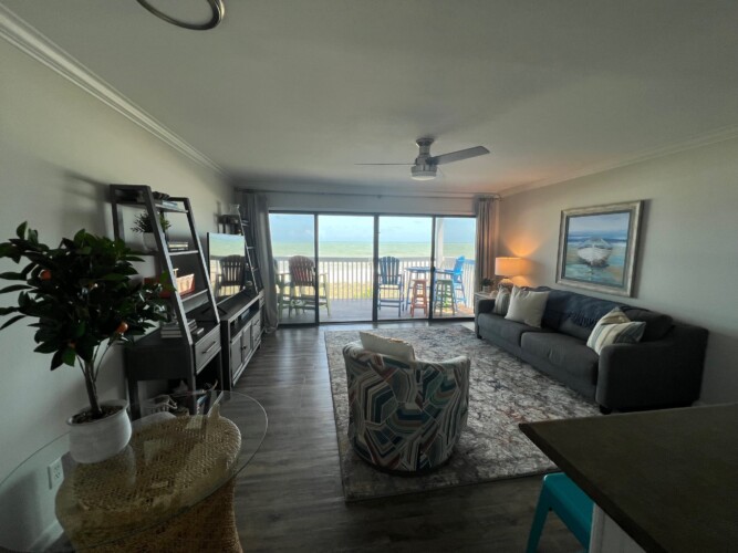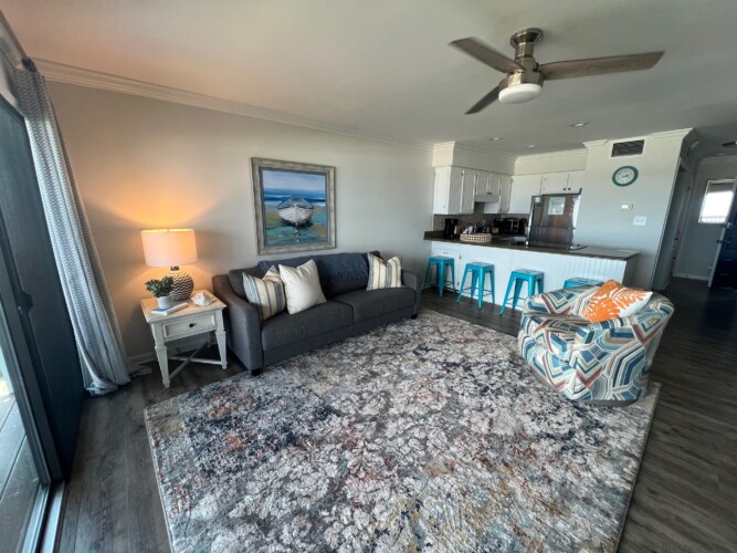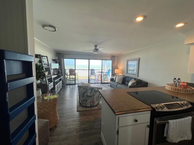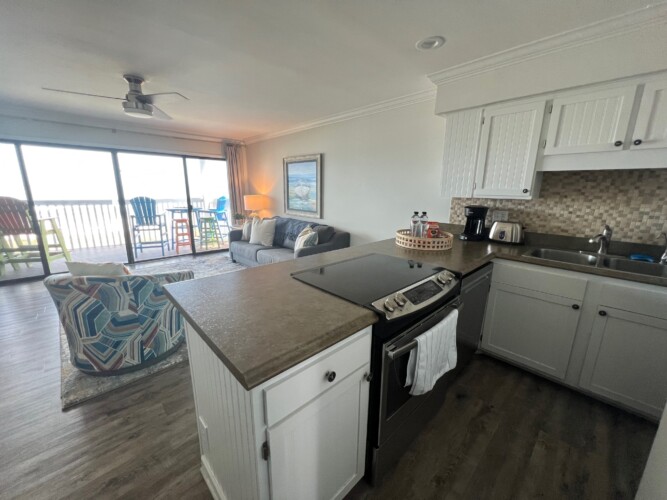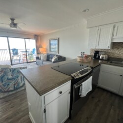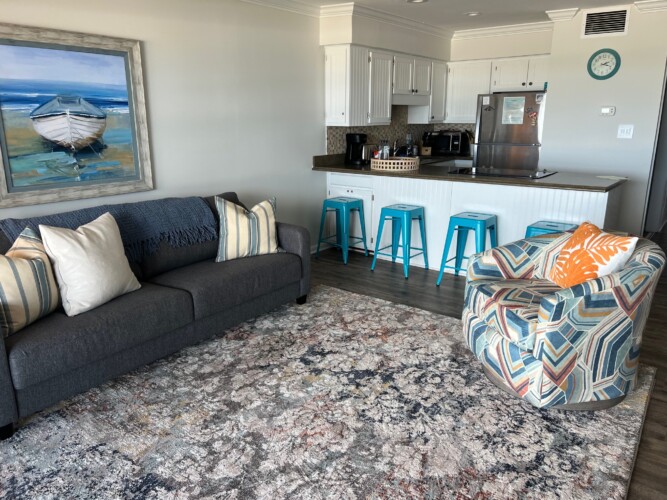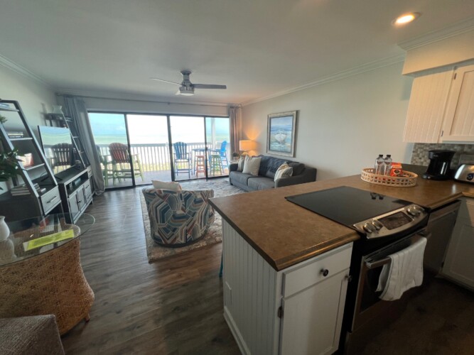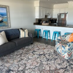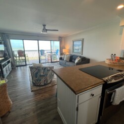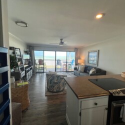 This condo has a very open feel and fantastic ocean views! The cozy living room has a wall of windows leading to the balcony, so you can see the ocean from anywhere in the main living spaces. It’s open to the dining area with a small table as well as the kitchen that has additional bar stool seating. The kitchen is stocked with all the essentials you’d need to cook a meal during your stay. There is 1 bedroom with a queen size bed, a bunk bed off the entrance, and a sofa bed making it the ideal stay for up to 6 guests. You’ll love sipping your morning coffee on the balcony or unwinding at the end of the day while enjoying the sea breeze.