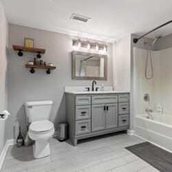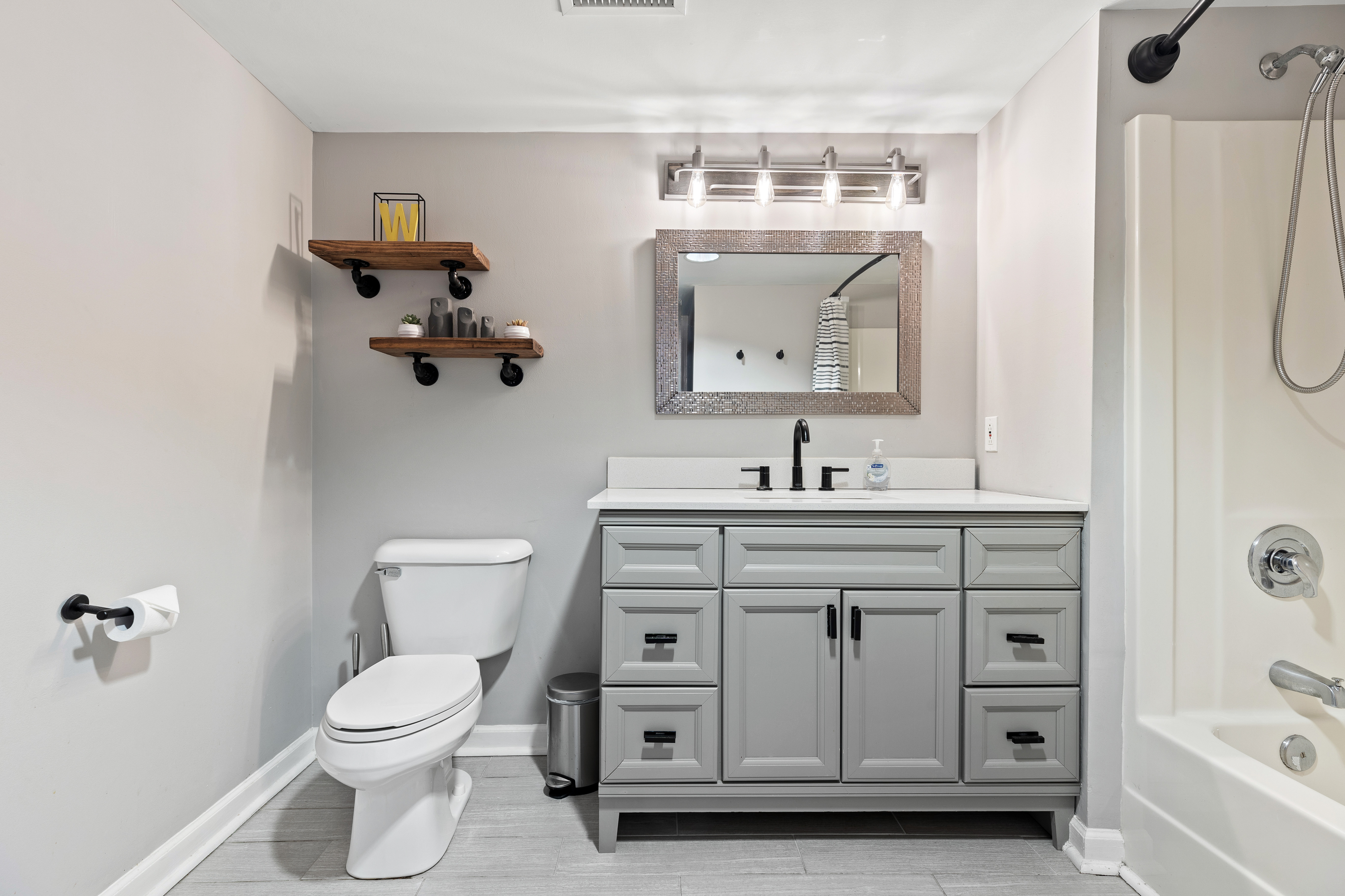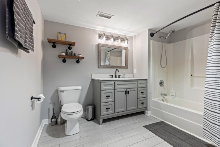 The bedroom has an upholstered queen size bed, a spacious closet for storing your clothing, and extra sheets, pillows, and blankets to make your stay as comfortable as possible. The bathroom features tile flooring, a large vanity with a granite countertop, and some essentials to use during your stay.