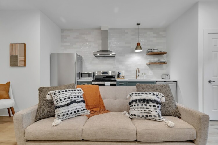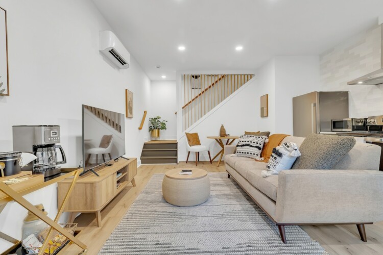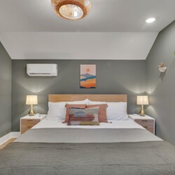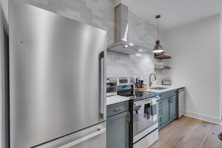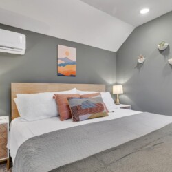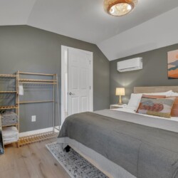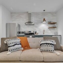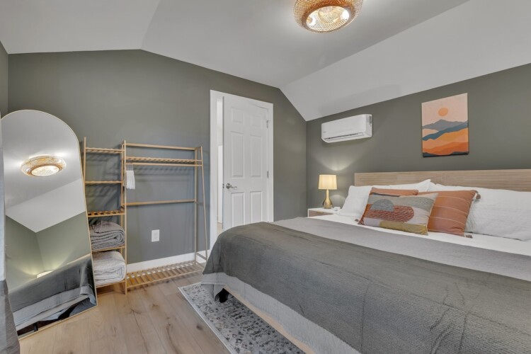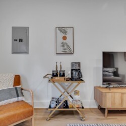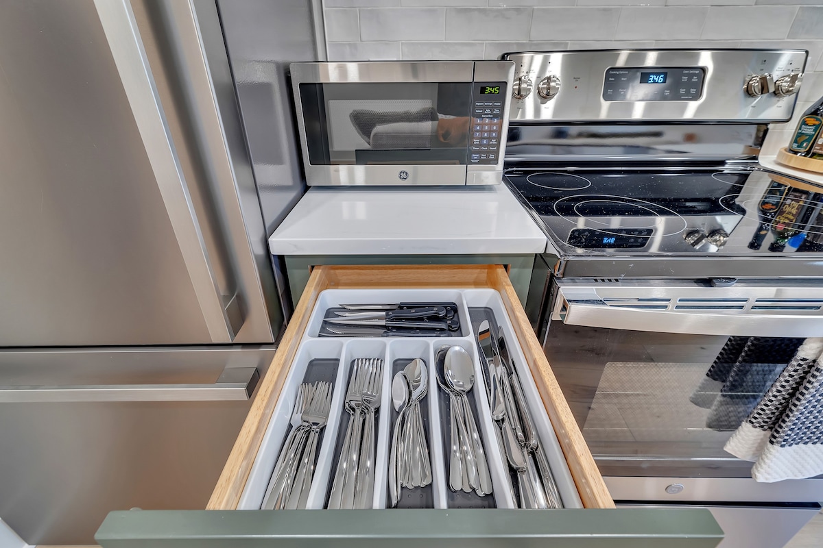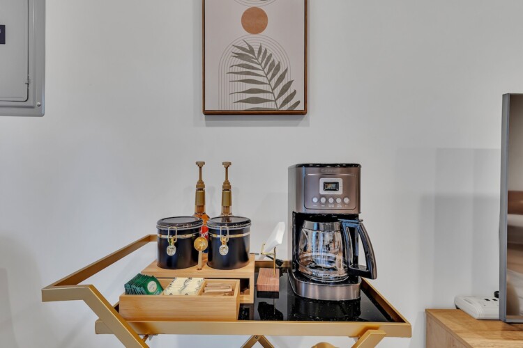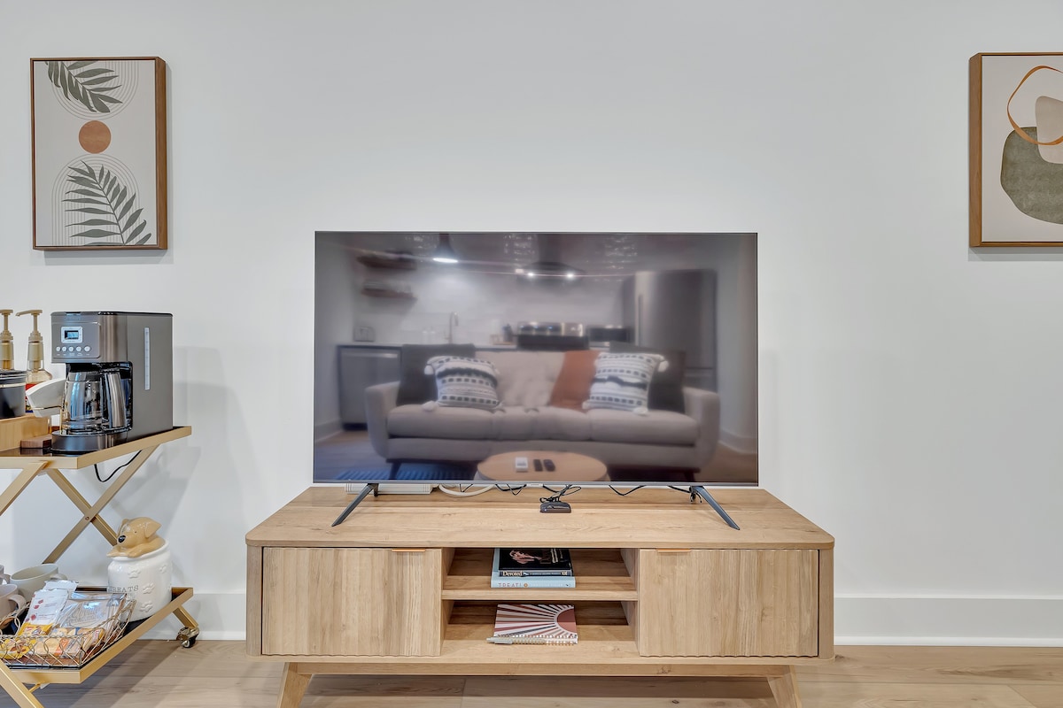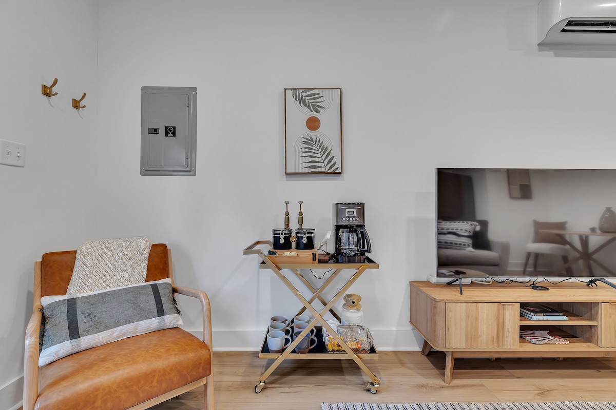 We’ve tried to make every aspect of this place as comfortable for guests as possible! The living room has a 55 inch TV, board games for you to enjoy, and plenty of blankets and pillows. The kitchen has all of the essentials you’d need for cooking including olive oil and seasonings. The fully stocked coffee bar is complete with coffee, creamer, sugar and flavor syrups. The bedroom has a king size bed, black out curtains, and a storage area for your clothes. You’ll also have access to a washer and dryer in the bathroom.