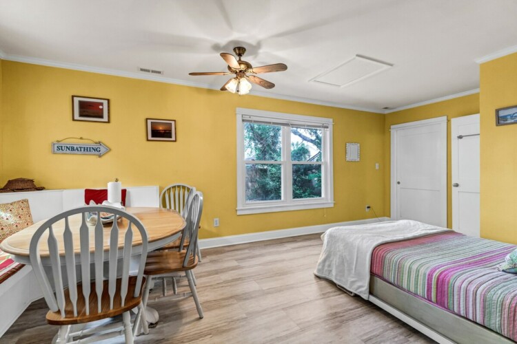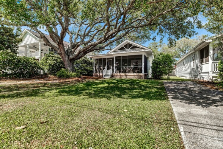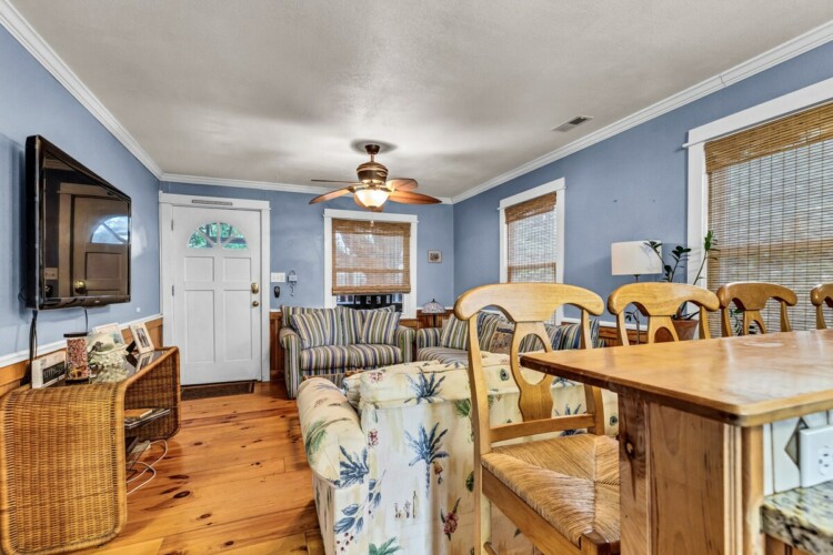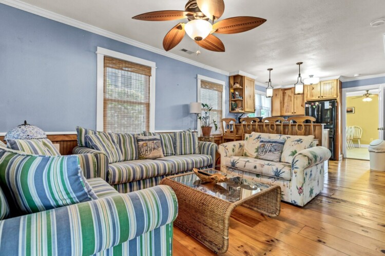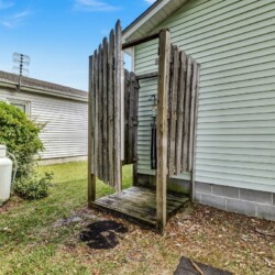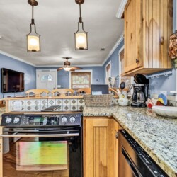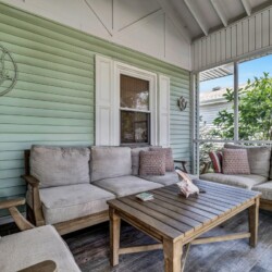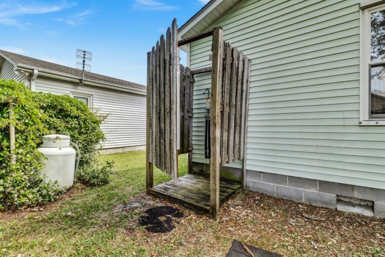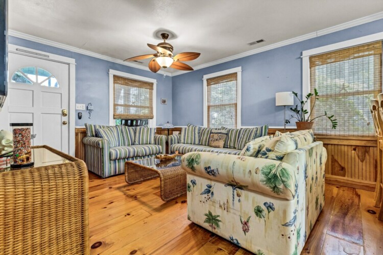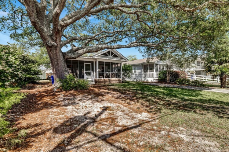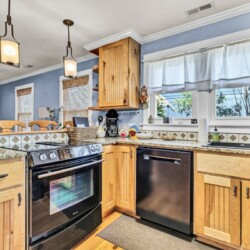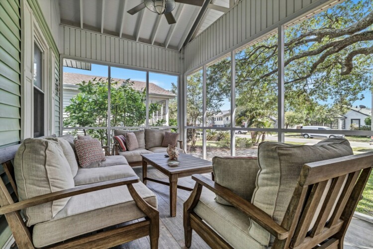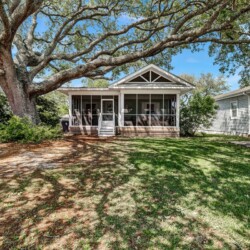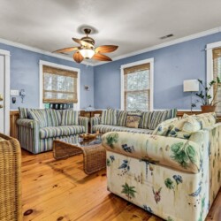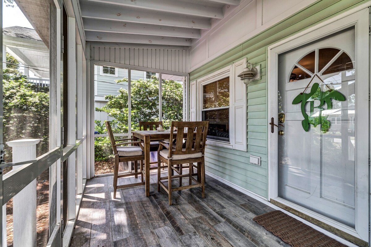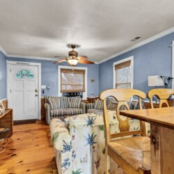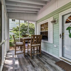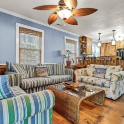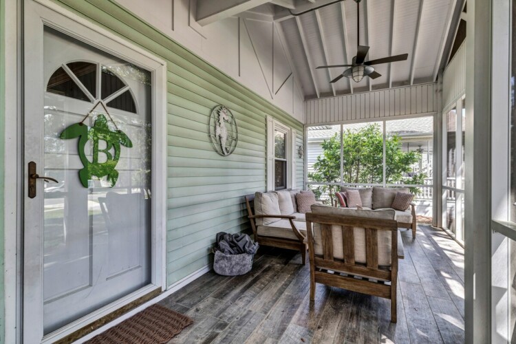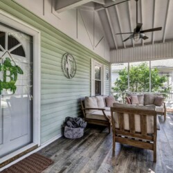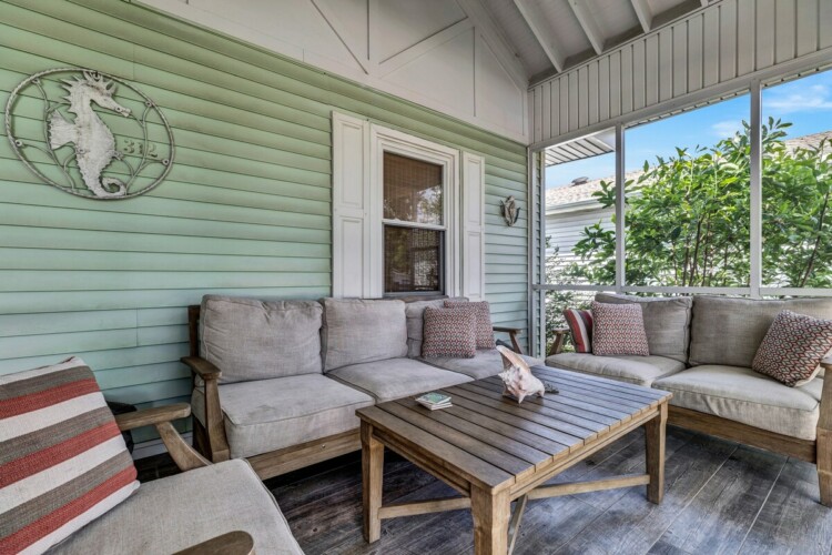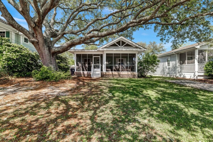 The main living spaces of this home are open concept, so the living room with plenty of seating space for your group opens right into the kitchen. There is counter seating at the kitchen peninsula, and it has been stocked with all of the essentials that you’d need to enjoy a home cooked meal during your stay. There’s an additional dining nook for extra indoor seating as well as an outdoor table. Two of the bedrooms have queen size beds, and there is a murphy bed in the third that can be put up for additional space when not in use. The best part of this home is the outdoor space! There’s an outdoor shower perfect for coming back from the beach, and the screened in porch is a great place to unwind at the end of the day.