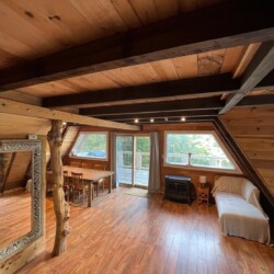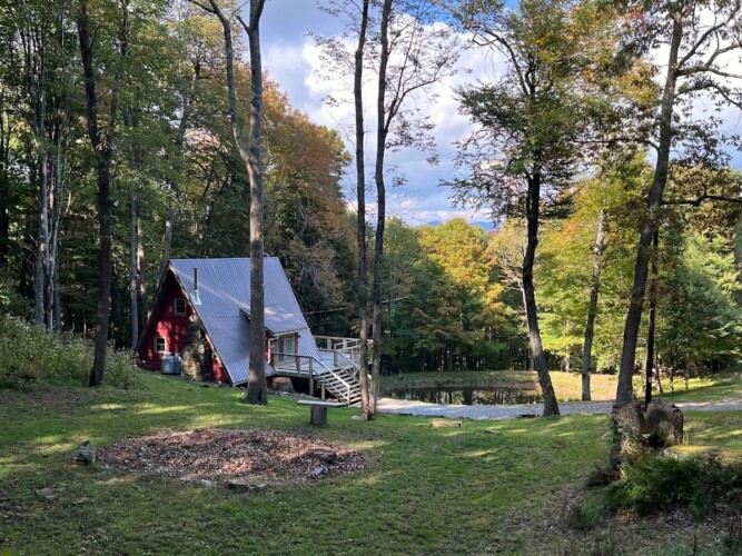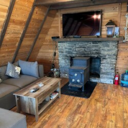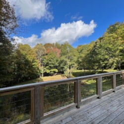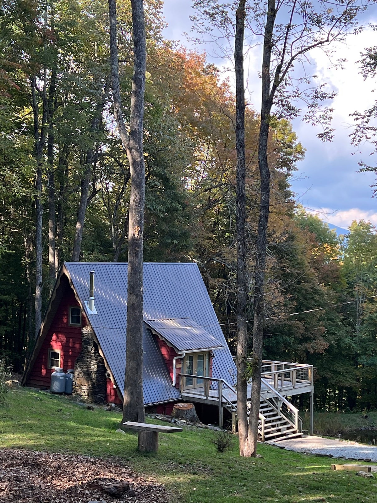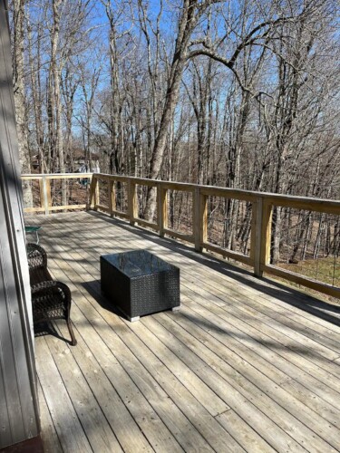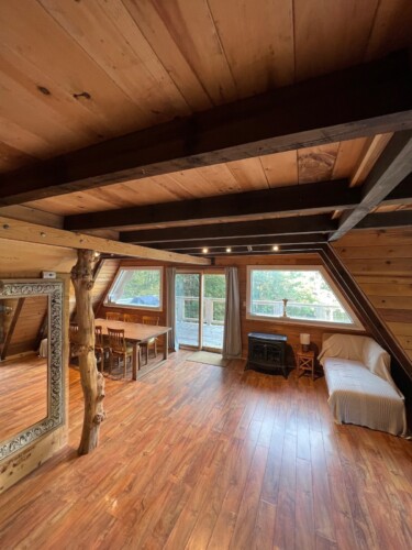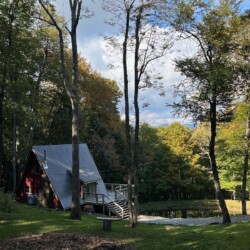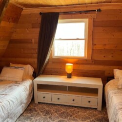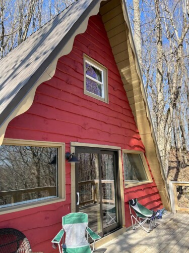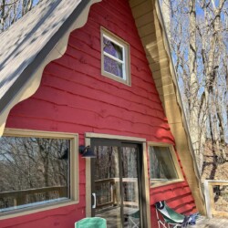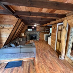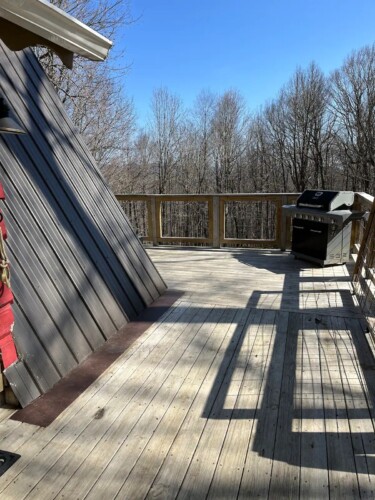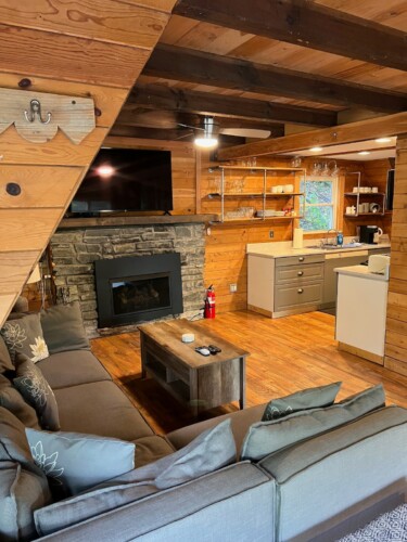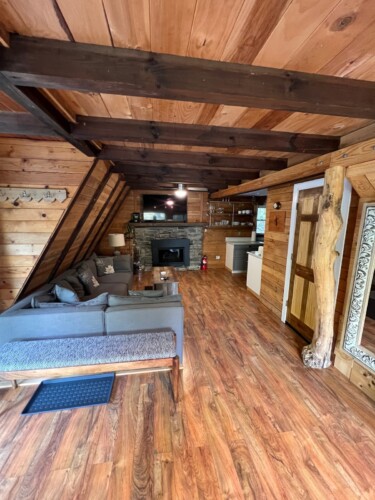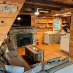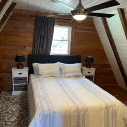 This A Frame cabin has all the charm you’d want in a mountain getaway! The main level includes all of the main living spaces. There’s a cozy living room that centers around a propane fireplace and leads to the kitchen which is stocked with essentials that you’d need during your stay. If you choose to enjoy a home cooked meal, there is a large dining table near the windows where you can eat and enjoy the view. Upstairs, there are 2 bedrooms – one with a twin bed and one with a queen. The lower level of the cabin includes an additional queen bedroom, and another full bath. The best feature of the cabin is it’s beautiful lake view and large deck area.