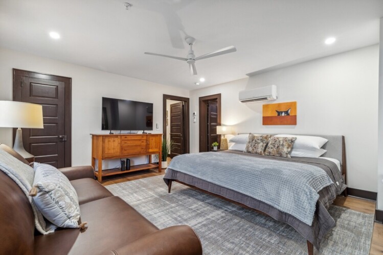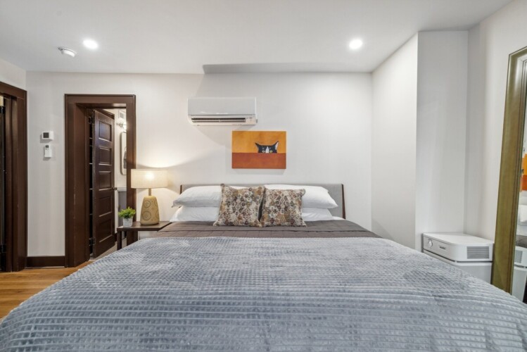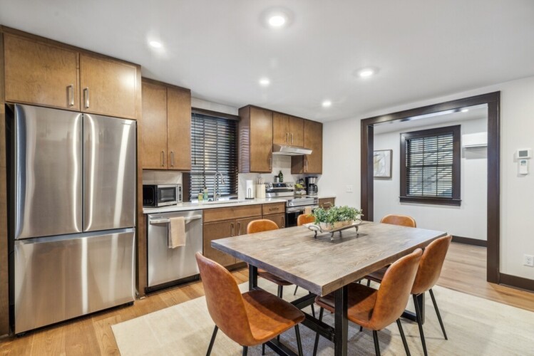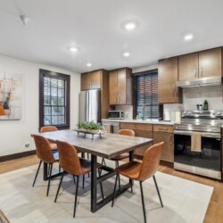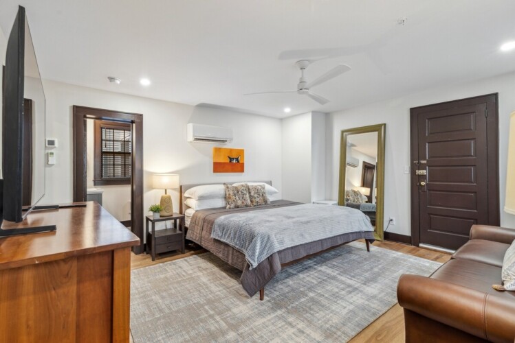 This charming one bedroom apartment was just lovingly updated from floor to ceiling. The spacious kitchen is fully stocked with all of the essentials that you would need to enjoy a home cooked meal during your stay. The large dining table offers plenty of space for your morning coffee or evening meal. The bedroom includes a king sized bed and closet space for your clothes. There is also a sofa where you can relax and watch TV as you wind down after a day of exploring. Off of the bedroom, there is a full bathroom with a tiled walk in shower. This property also has a washer/dryer for use during your stay.