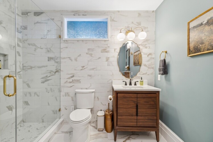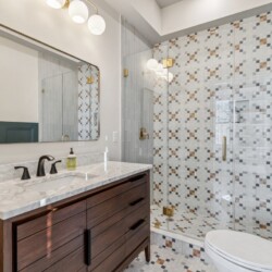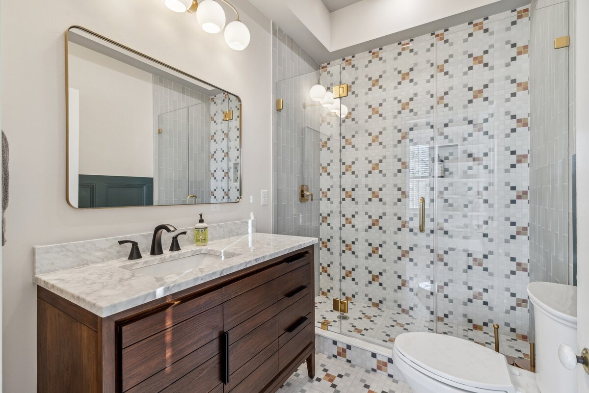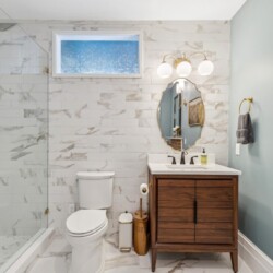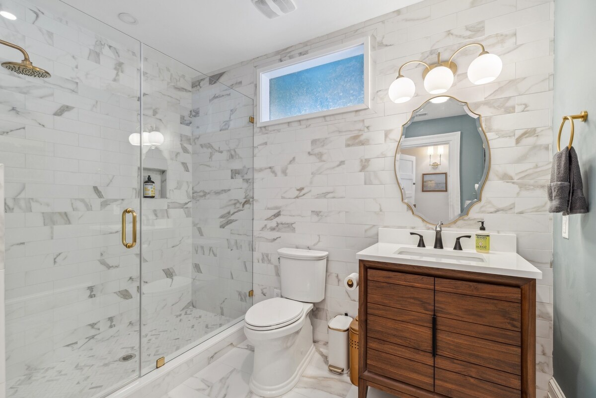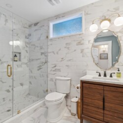The spacious living room centers around a decorative mantel and has plenty of seating space for you to relax and unwind at the end of the day. The large bedroom gets plenty of natural light and features a king size bed and beautiful built ins. Off the bedroom, there is a designated office space with a desk in case you need to work during your stay. Two full bathrooms each with a walk in shower and beautiful tile work complete the space.