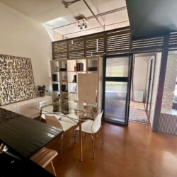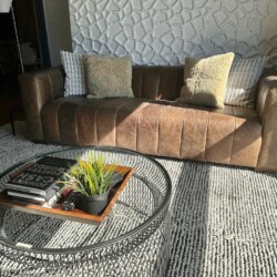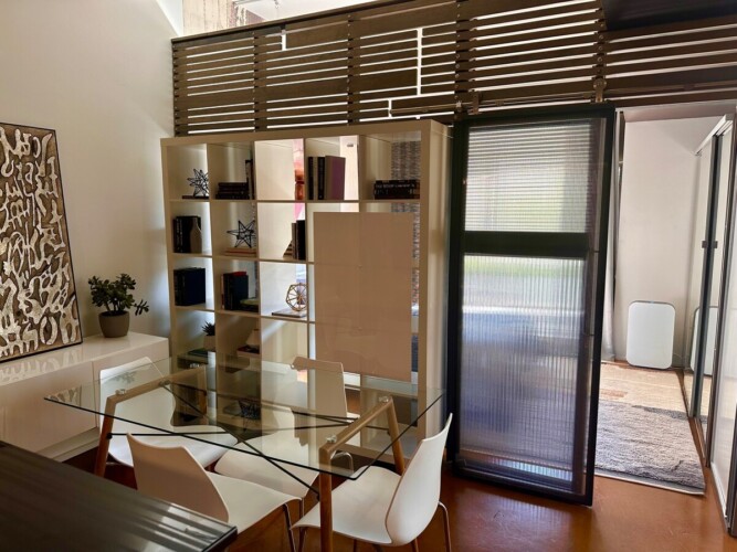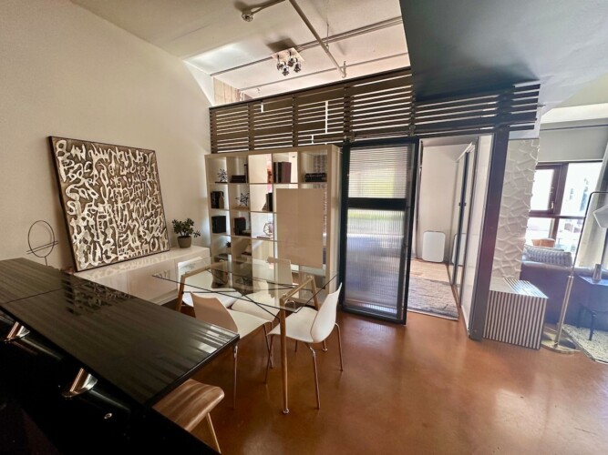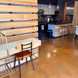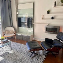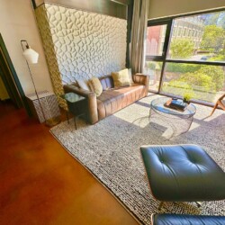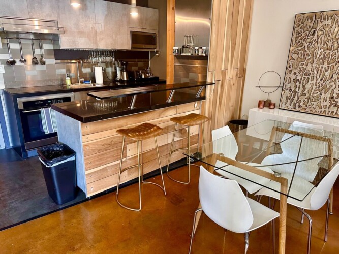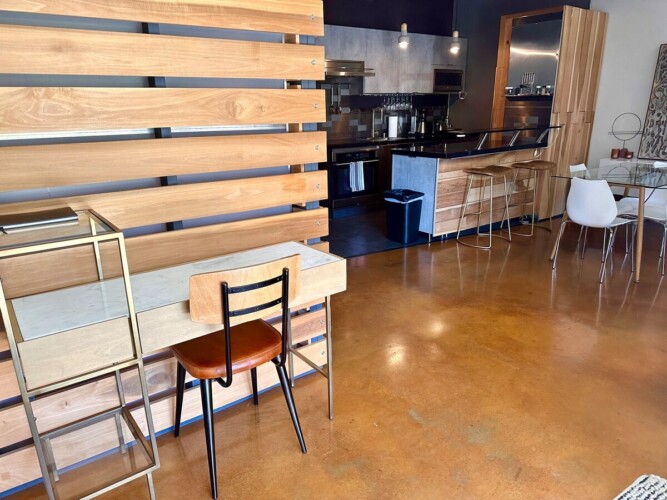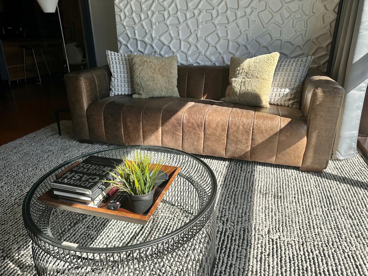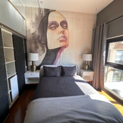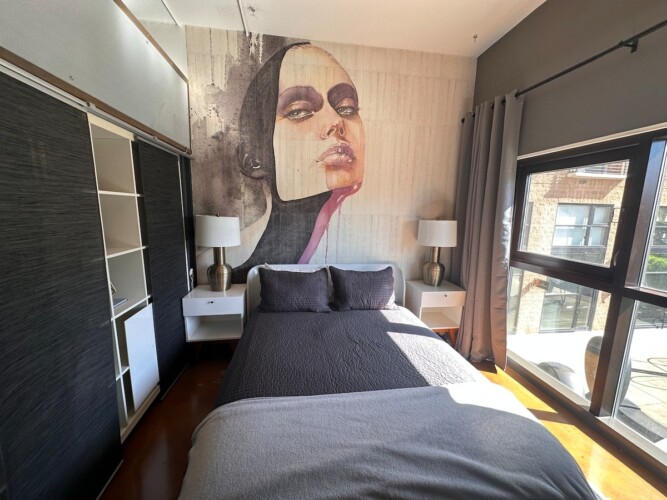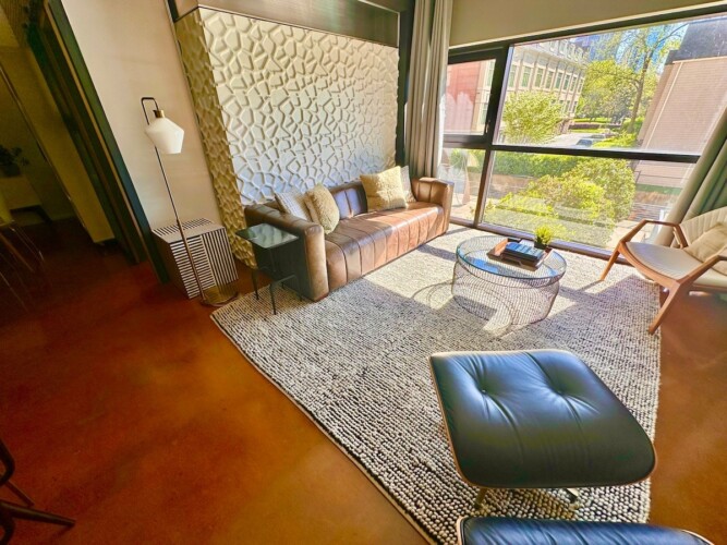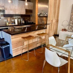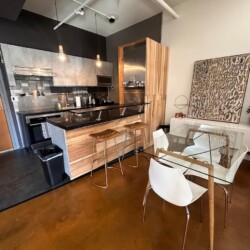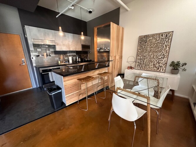 This large studio features an open concept kitchen, dining, and living areas. The modern kitchen is fully stocked with all the essentials that you’d need to enjoy a home cooked meal, and there is plenty of seating at the dining table. The bright living room features an electric fireplace, large windows with great city views, and plenty of comfortable seating. The bedroom has been separated from the main living spaces for privacy and is complete with comfortable linens and a fantastic feature wall.
